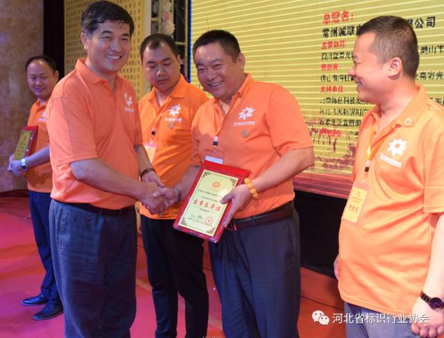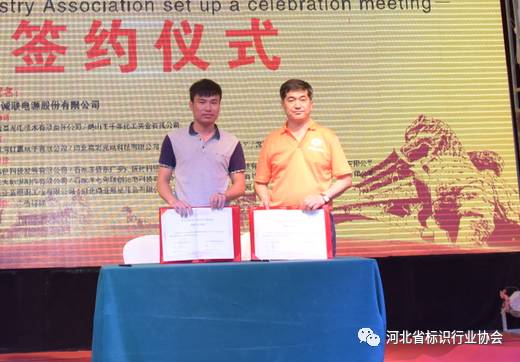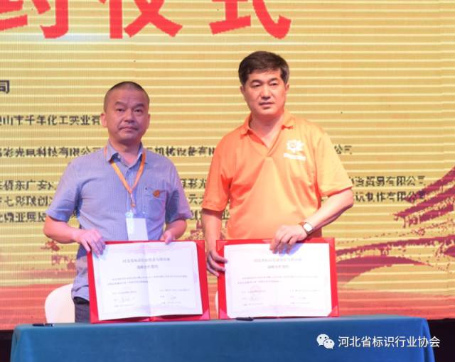 大会环节中河北省标识行业协会成功与石家庄铁路职业技术学院人文社科系主任卢矜、河北科技大学艺术学院副院长段建坤、常州诚联电源股份有限公司谢梦奇经理、四川蓝景光电技术有限责任公司刘彪总经理、鹤山市千年化工实业有限公司周国良总经理签订了战略合作协议。